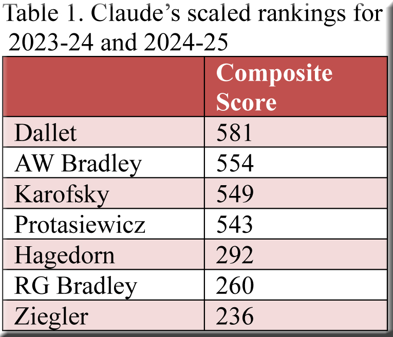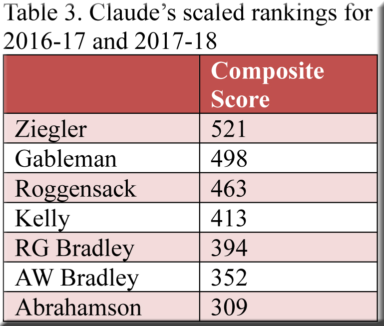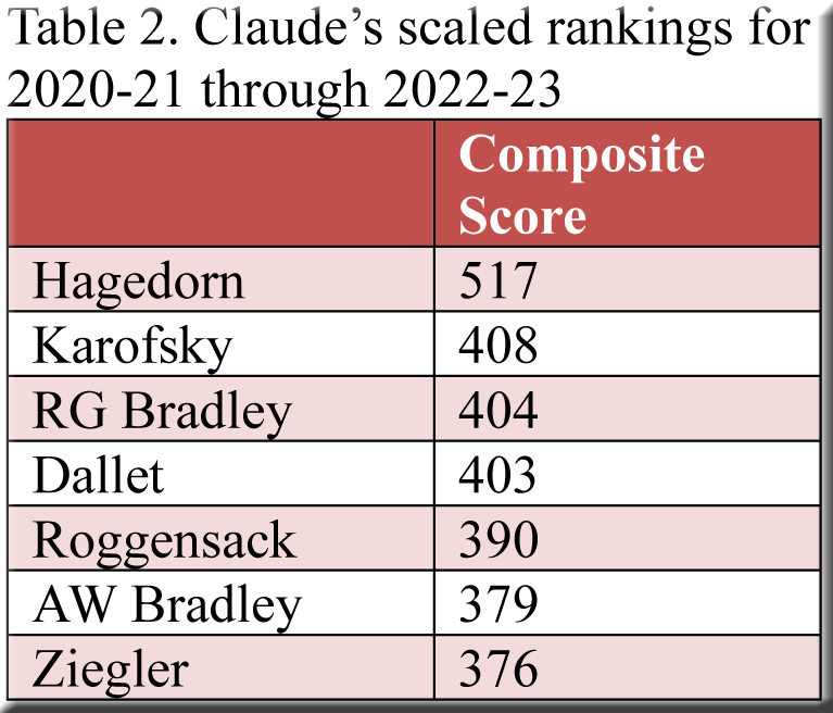 Claude’s approach underscores findings from previous posts that noted Justice Hagedorn’s outsized influence during the three terms when he served as a swing vote between the liberals (Justices AW Bradley, Dallet, and Karofsky) and conservatives (Justices Roggensack, Ziegler, and RG Bradley). Table 2 lists Claude’s rankings for these three years, and Justice Hagedorn does indeed occupy the top row. Not only that, the gulf separating him from the next justice (Karofsky) is enormous—109 points—82 points larger than the difference between Justices Dallet and AW Bradley in Table 1. In short, Justice Hagedorn thoroughly dominated Claude’s metrics, placing first in three categories: majority opinions, 4-3 wins, and overall wins.